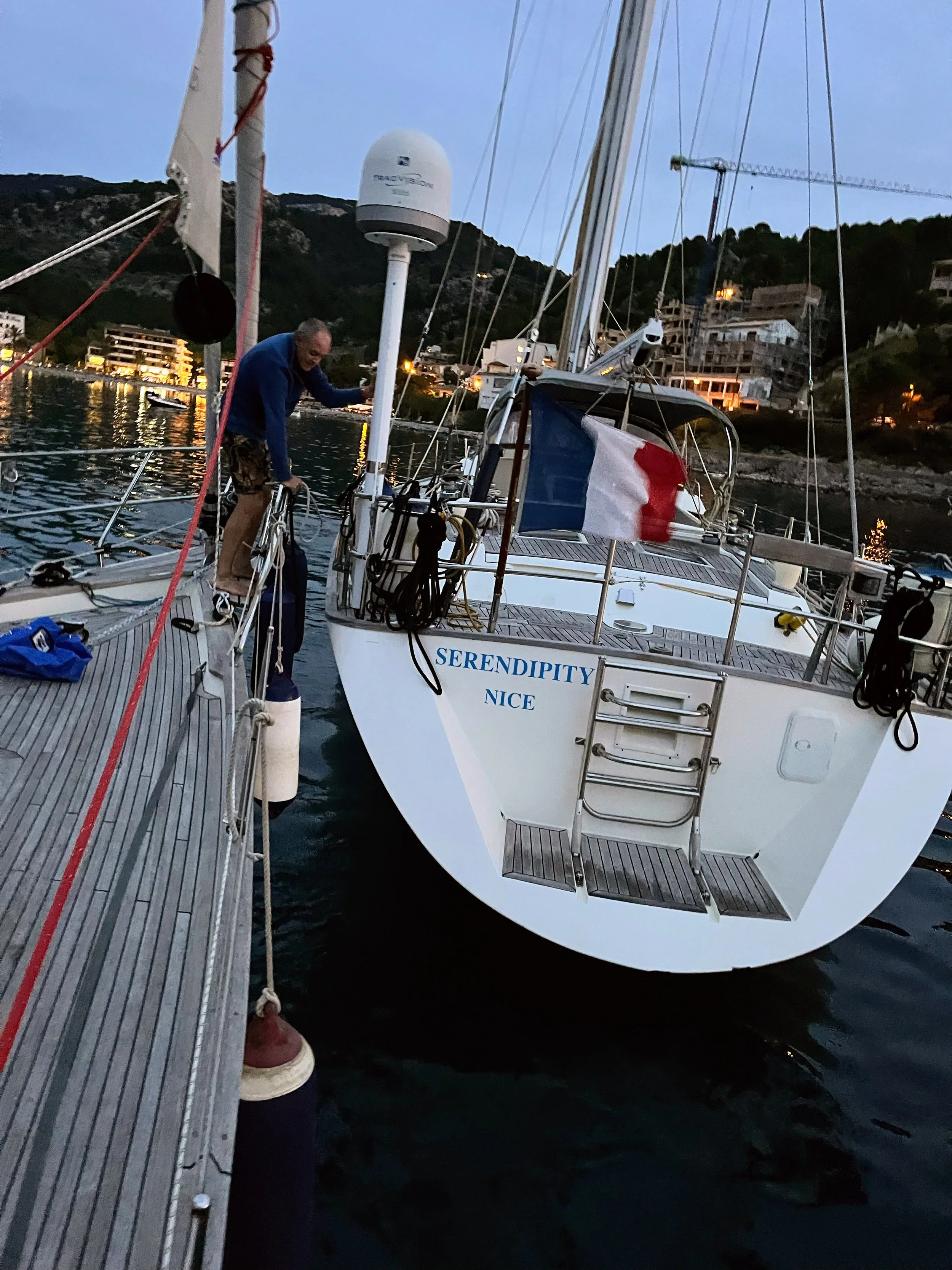 …a big French oyster decided to anchor where there was no space and then leave their boat to go to dinner. It bounced between and hit three boats, Arkyla being one of them. James bearing off with fender…We all waited up (obviously) with flood light on the ready for when they returned in their dinghy…